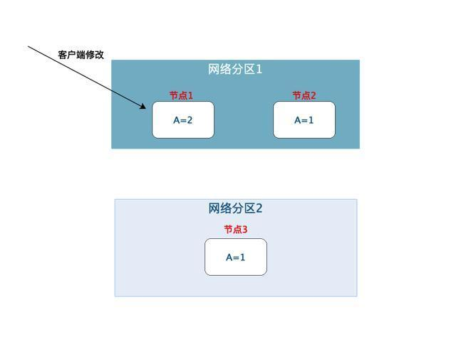 当客户端将节点1上的A修改为2后,系统出现了网络分区,其中节点1和节点2在一个网络分区中,而节点3在另一个分区中