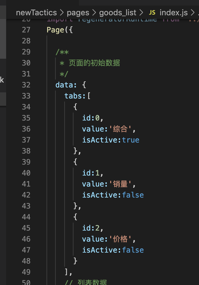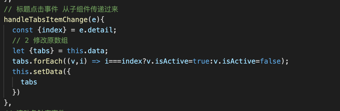 2.在子组件tabs.js的点击方法接收一个参数e在获取e的currentTarget底部的传值内容,在定义一个父组件的触发事件的自定义方法handleTabsItemChange