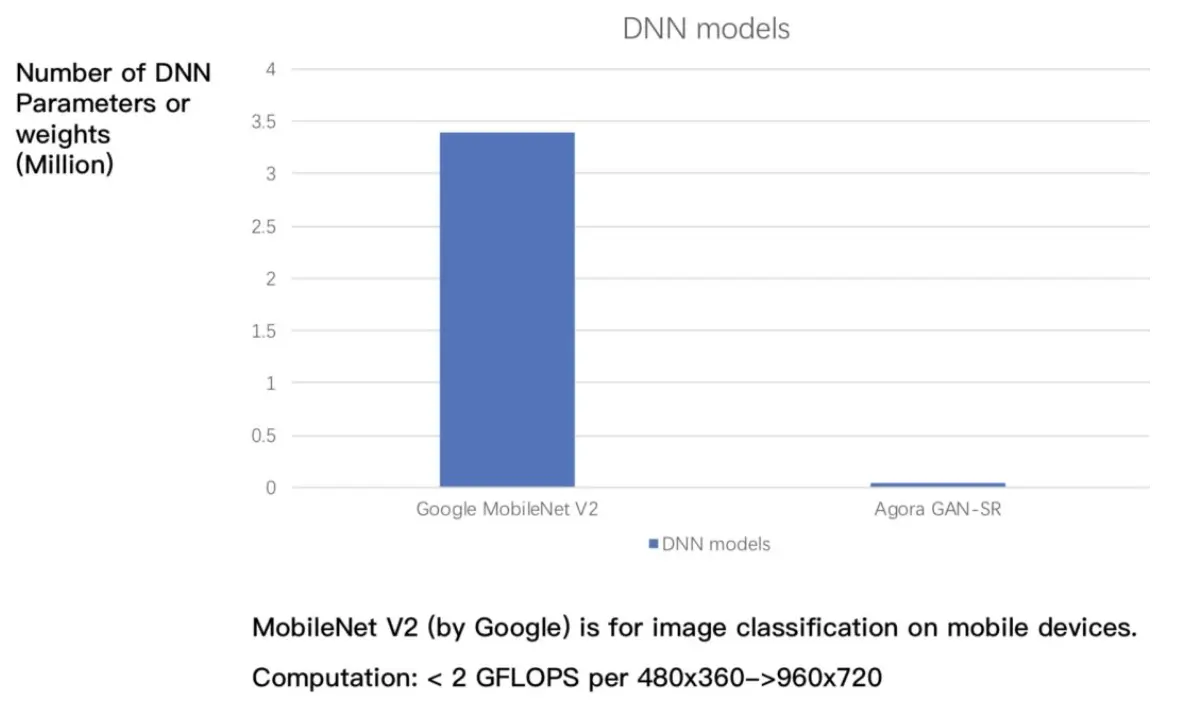 在以上的研究基础之上,声网也自研了超分算法。声网的超分模型的体积,比mobilenet v2还要小。对360p的图像进行2倍的放大时,其运算复杂度小于2GFLOPs,可实现在移动设备上的实时运行。在运算速度和超分效果实现较好的前提下,有效地提高移动实时音视频的用户体验。