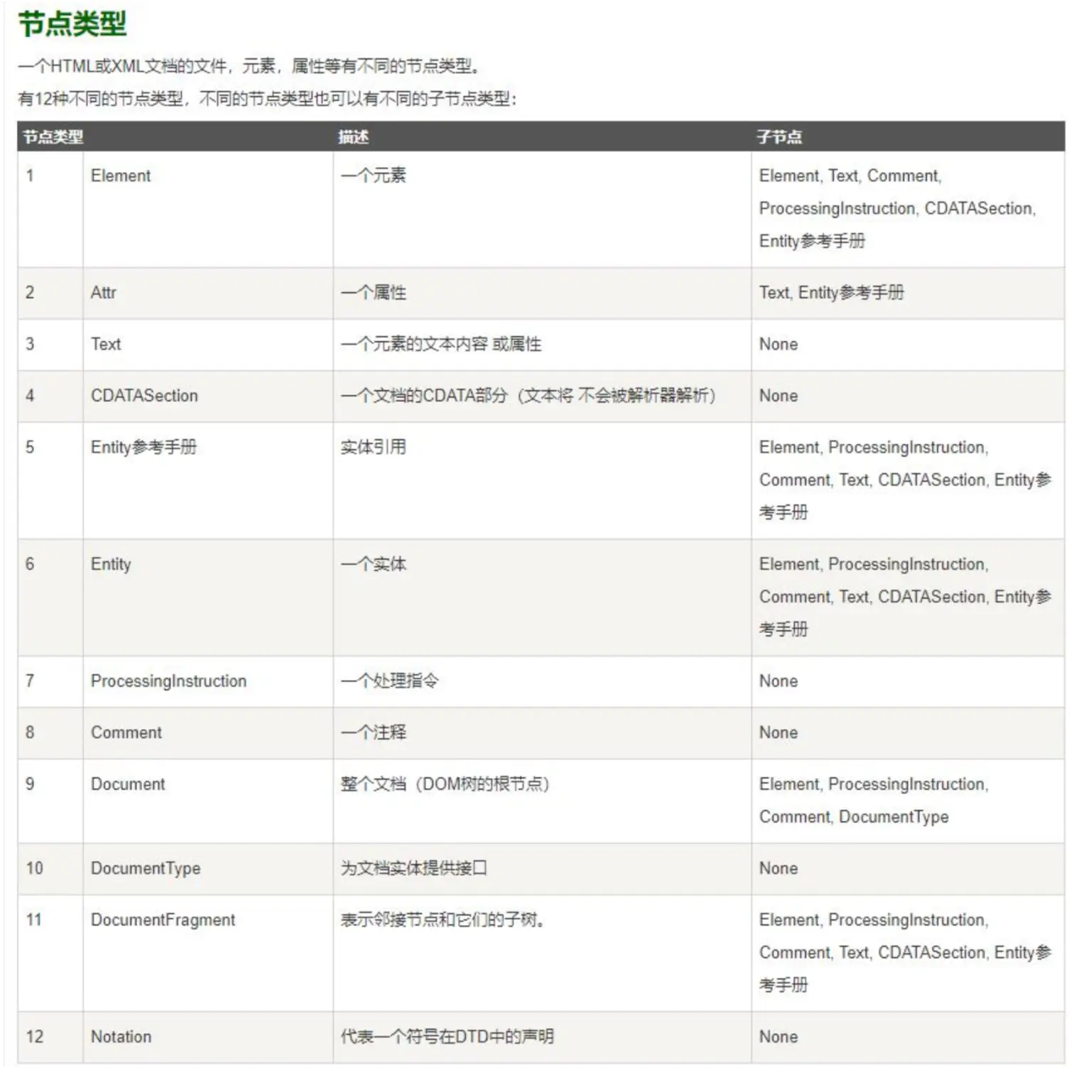 DOM 树中所有的对象都是节点,如:文档节点、元素节点、属性节点、文本节点、注释节点等; 节点相关的属性如下: nodeName 获取节点的名称,只读 nodeValue 获取节点内容(适用于文本节点和注释节点) nodeType 获取节点类型,只读 -