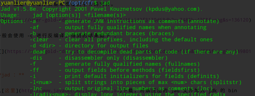 从 这里 下载对应系统的压缩包,将解压出的 jad 文件加入 jdk 的 bin 目录下,输入 jad 跳出如下帮助文档时,就说明可以用啦。