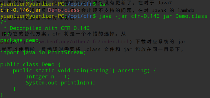 而作为它的替代方案,cfr 将是一个不错的选择。从 这里 下载对应系统的 jar 包就可以使用啦,反编译时需要将 .class 文件和 jar 包放在同一目录下。