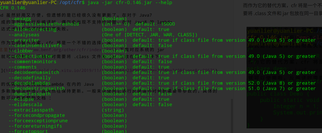 它的优势在于支持包括 lambda 在内的 Java 众多新增语法特性,且依然在保持更新。一般来说使用它进行反编译的时候是需要带参数的,具体的参数信息可以参考帮助文档 :