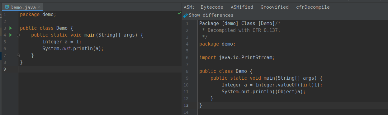 jad 的优势在于操作方便,且可以直接将 class 文件反编译为 Java 文件,对用户十分友好。比如相比起 javap,通过它进行的反编译就能让我们清晰看出这个从 int 到 Integer 的装箱过程,而这一过程能够帮助我们更好地理解一些编译器的中间操作。