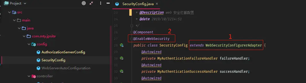- 自定类 SecurityConfig 继承了 WebSecurityConfigurerAdapter,说明SecurityConfig将会是一个 Http安全配置适配器