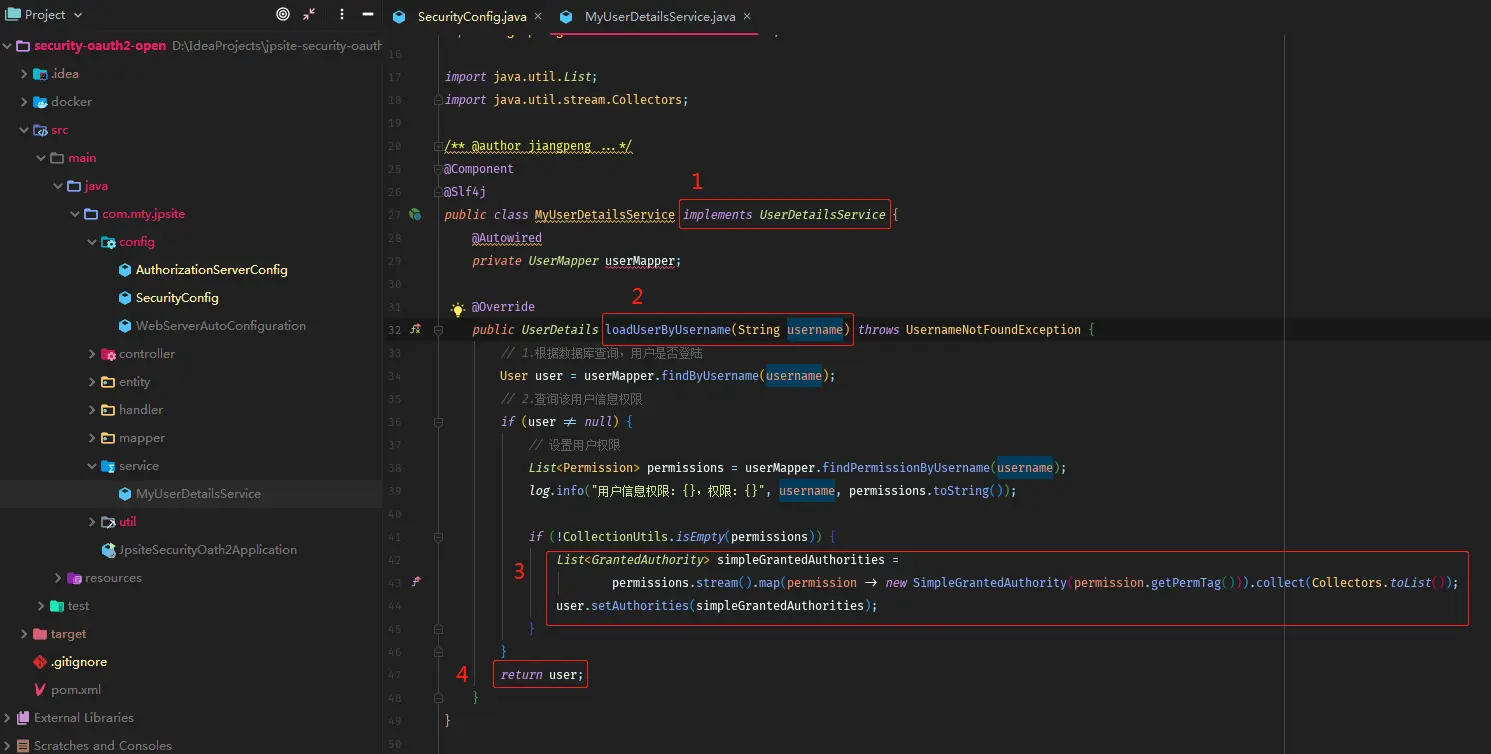 - 自定类 MyUserDetailsService 实现了 spring security的UserDetailsService 接口