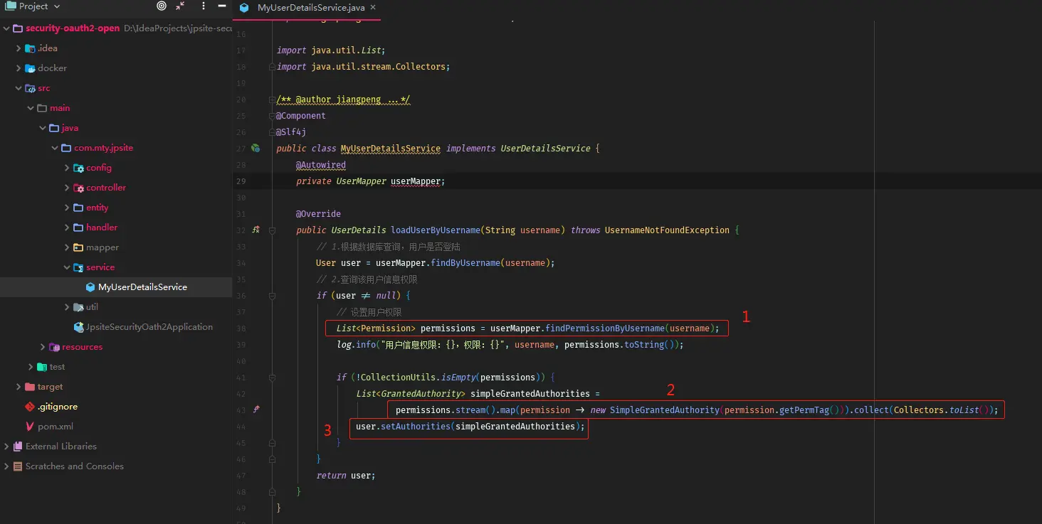 - 获取用户权限表对应的权限详情,并把内容设置到 UserDetails.Authorities属性中