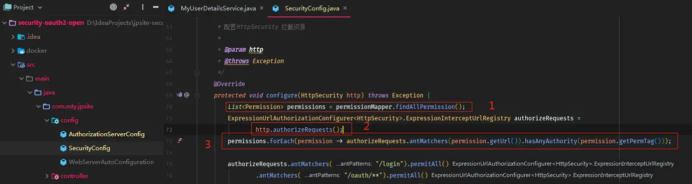 - 把权限表中的内容全部设置到 authorizeRequests中, antMatchers表示拦截的url, hasAnyAuthority表示可以访问的权限标识