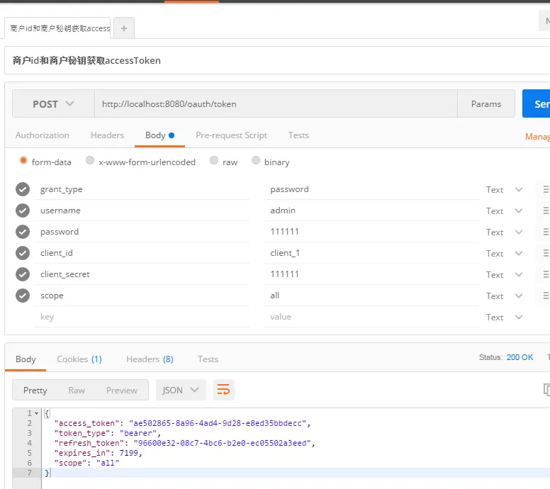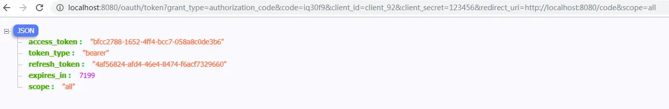 用授权码获取access_token 请求url: http://localhost:8080/oauth/token?grant_type=authorization_code&code=8fGtOV&client_id=client_92&client_secret=123456&redirect_uri=http://localhost:8080/code&scope=all