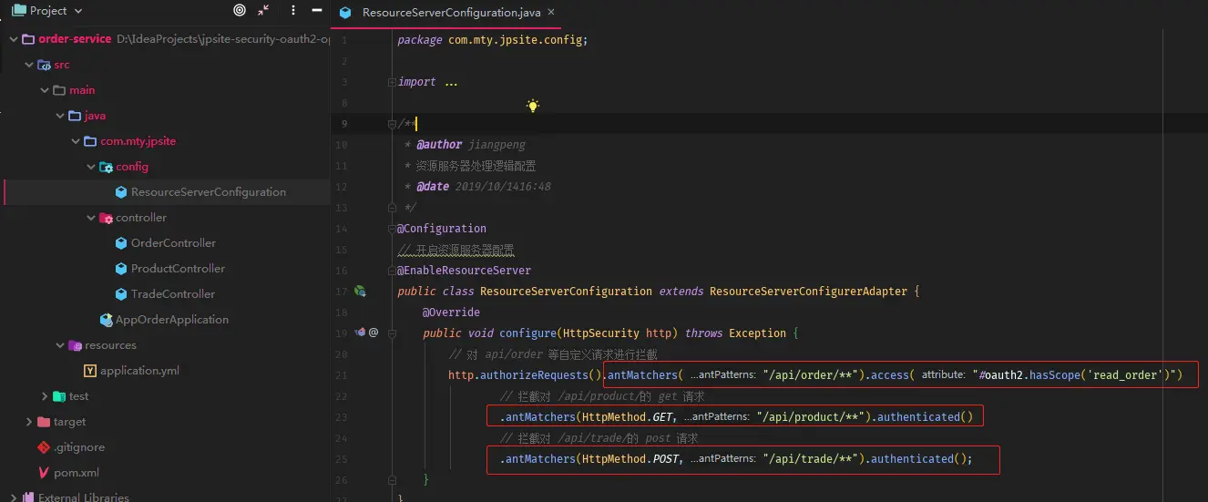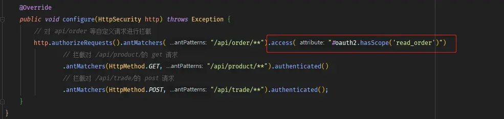 antMatchers() 和 authenticated() 方法来配置,查看图中红框内的内容, 这些都是代表需要拦截验证的请求路径url,除了拦截请求外,还可以指定拦截请求方式,比如访问 /api/trade/ ,只对 POST 访问做拦截, GET 请求的访问一律放行。
