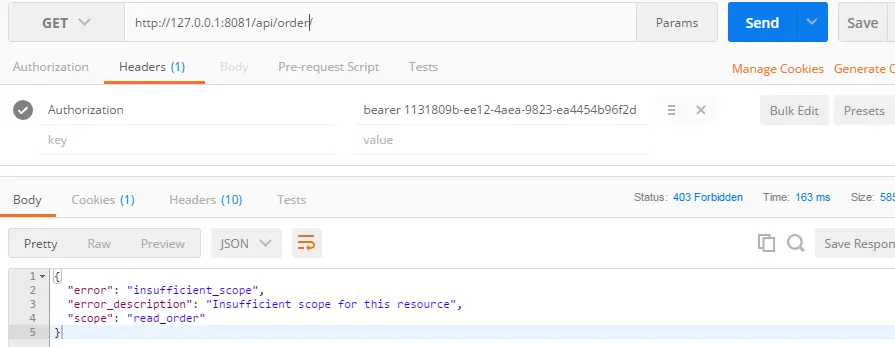 access() 方法指定访问的该 url 需要的 scope,取值为 oauth_client_details 表中的 scope 值, 如果scope值与代码中定义的不一致,则会出现如下错误:
