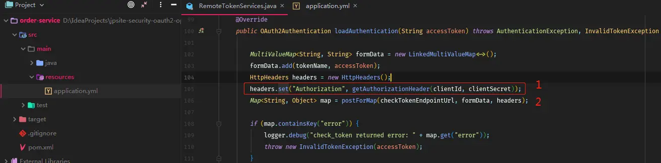 spring-security-oauth2-2.2.1.RELEASE-sources.jar 中的 RemoteTokenServices.java 用于远程调用 token 服务(开发平台)进行操作