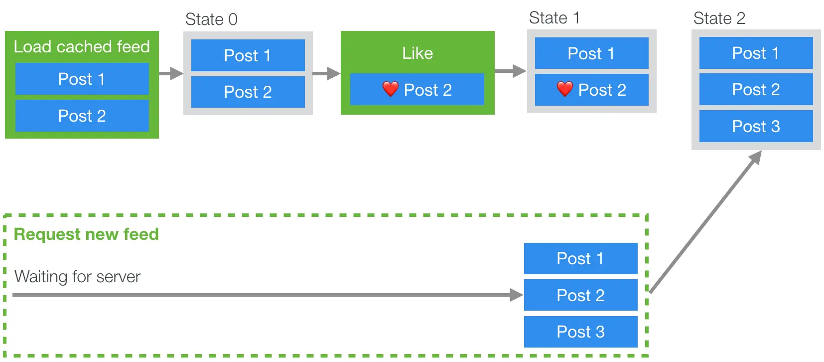 例如,如果我们要以简便的方式处理缓存,则可能会遇到以下问题:我们开始同时从缓存和网络加载,并且由于已准备好缓存的数据,因此将其显示给用户。 然后,用户点击喜欢该帖子,但是一旦最新的网络数据返回,它就会用一个副本覆盖该帖子,该副本会丢失用户对于缓存副本的操作(请参见下图)。