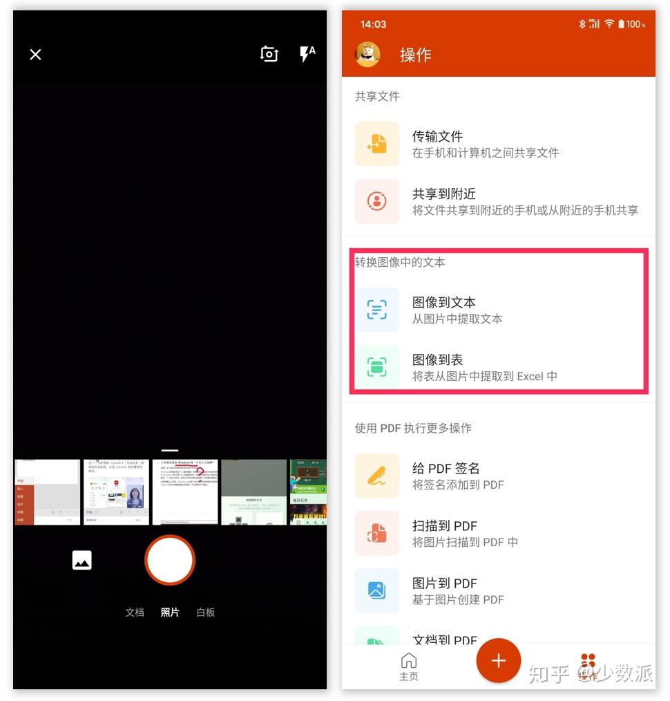 如果你在手机端需要时不时与这类文件打交道,整合版本不仅和独立应用一样可靠,也能让你在面对不同类型文档时更加游刃有余,免除一些不必要的应用跳转。但与此同时 Microsoft Office 的功能又不限于此,除了常见办公文档的处理,它还对另一款独立应用——Office Lens 进行了直接整合,点击主界面下方的添加按钮就能通过相机将纸质文档快速转换为电子文档,在导入表格、文本或 PDF 文件时非常高效便捷。