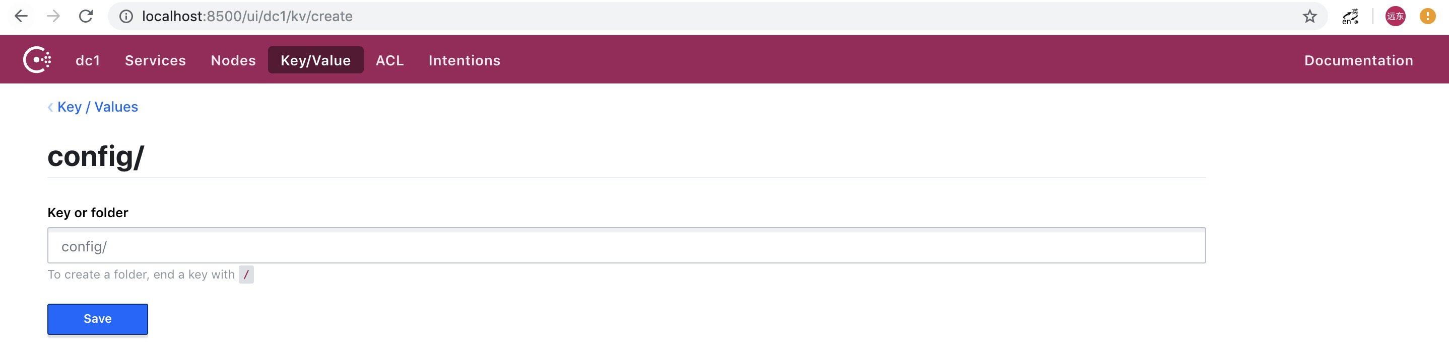 新建分两种类型:文件夹、Key/Value,创建文件夹只需在后面加上 "/" 即可