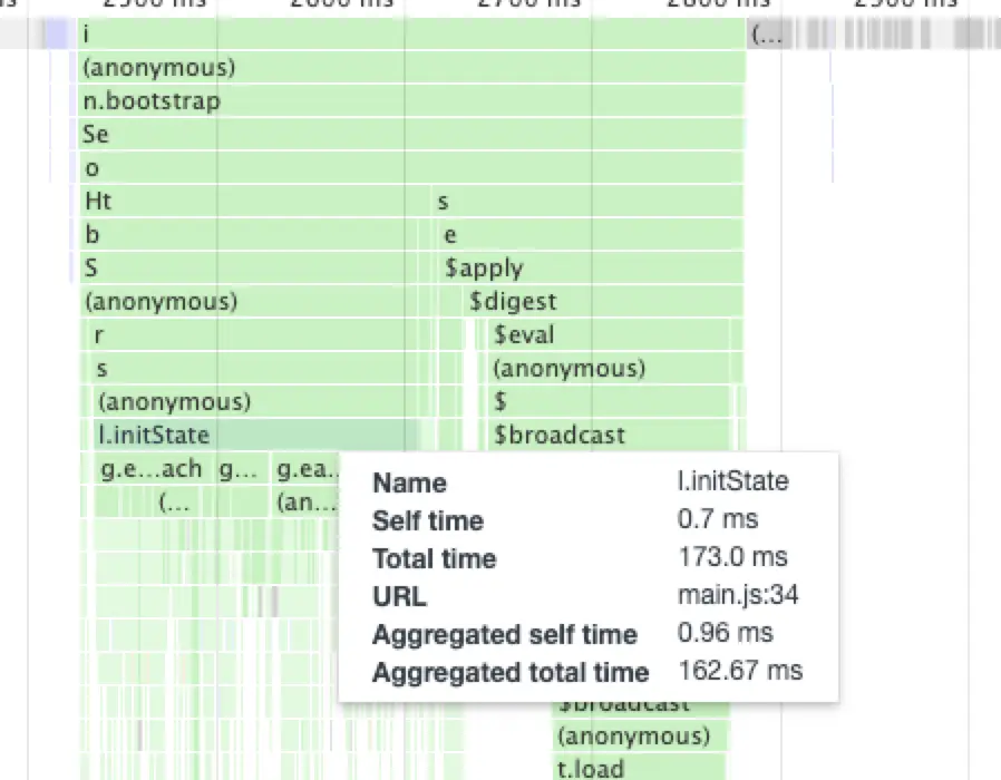 还可以顺着时间片段往下深究到底是哪个步骤耗时较长,从上面可以看到其中 l.initState 耗时 173ms,下面是几个 forEach,显然是这里的循环性能消耗比较大,点击时间片段会跳转到 source 面板的对应代码中,排查起来非常方便。