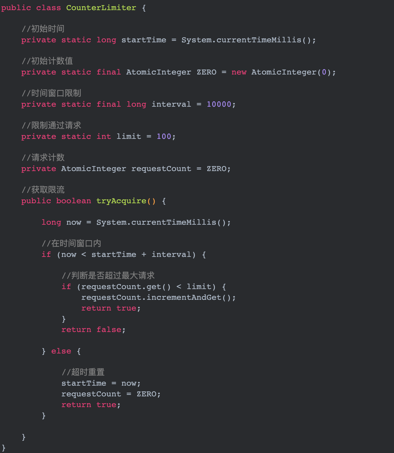 计数器限流允许出现 2*permitsPerSecond 的突发流量,可以使用滑动窗口算法去优化,具体不展开。