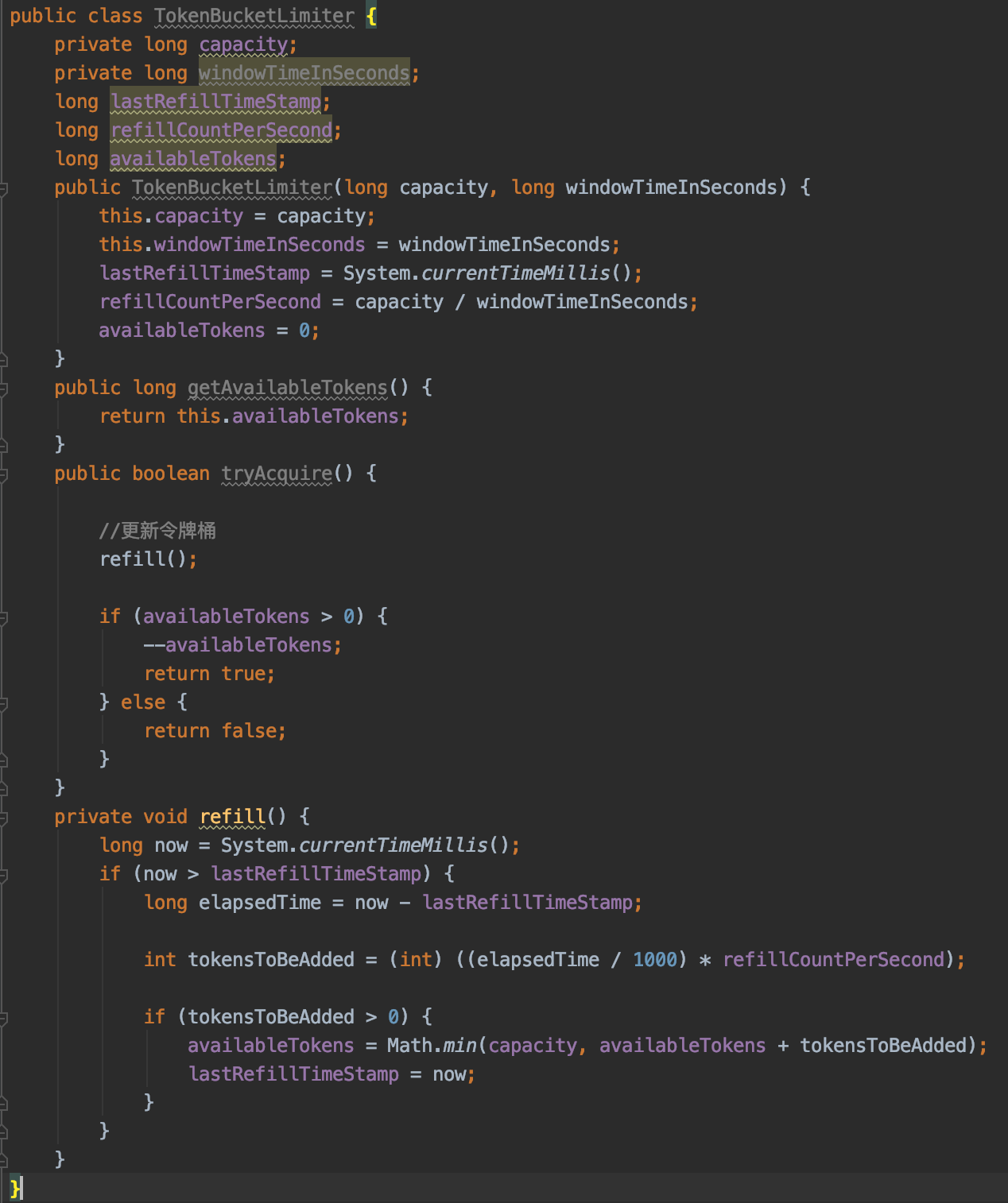所以令牌桶允许出现瞬间出现permitsPerSecond的流量,但是不会出现2*permitsPerSecond的流量,漏桶的速度则始终是平滑的。