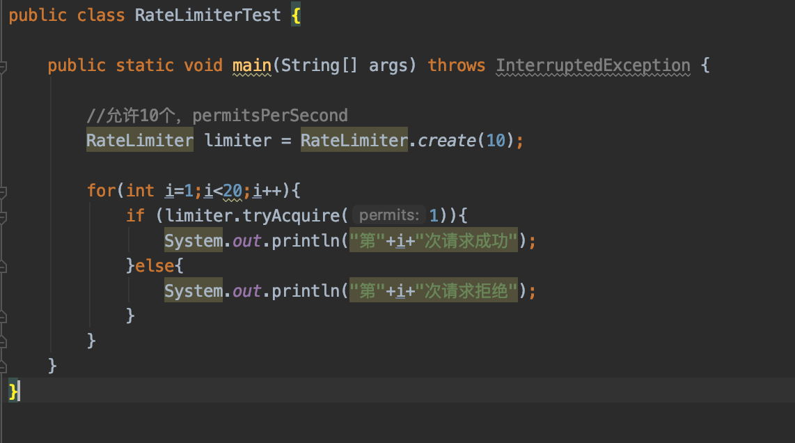 RateLimter提供的API可以直接应用,其中acquire会阻塞,类似JUC的信号量Semphore,tryAcquire方法则是非阻塞的: