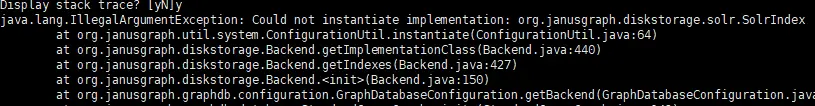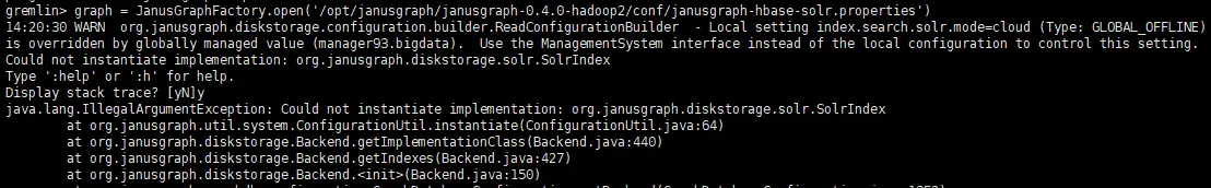 接上次,用hbase+solr配置启动打开graph图,graph = JanusGraphFactory.open之后 先是一个疏忽导致的异常,Could not instantiate implementation: org.janusgraph.diskstorage.solr.SolrIndex: