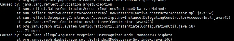 报错提示是未识别的模式: Unrecognized mode: manager93.bigdata,检查发现这是我误填写的一个solr服务域名,顺藤摸瓜找到这个配置是index.search.solr.mode将其更改为cloud。
