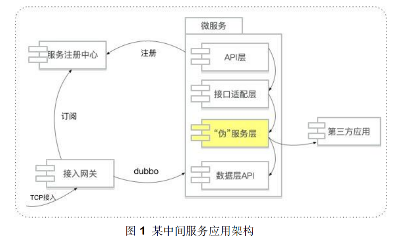如图 1 所示,中间服务应用采用分布式微服务架构。技术平台在集成 dubbo 分布式框架的时,为了对现有平台产生较小的侵入,平台抽象出一个“接口适配层”,开发人员无需关注该层,仅需针对具体业务开发相应的“伪”服务层, 此处的设计思想毋庸置疑。问题就出现在图 1 中的“伪”服务层(抱歉!是本人给该层的定义),单纯从架构图是看不出其任何问题的,需结合代码才会暴露出问题。“伪”服务层的用户上下文,即其接口的出入参数与厂商的商业技术平台高度耦合,这是一个非常严重的问题。试想,我们的核心业务逻辑写在该层,如今后技术平台升级或更换技术平台,势必会造成高昂的开发维护成本,后果可以说是灾难性的。其次,因“伪”服务层高度依赖技术平台的用户上下文,数据的存取均使用该上下文,这将会丢失应用系统最有价值的领域模型。此外,服务接口不仅仅是提供给第三方系统接入调用,进程内服务之间的接口调用也是很常见的,这种场景难道也需要调用方构造用户上下文吗?怎么会呢!这势必会在很大程度上降低服务接口的复用率。控制层也好,接入层也罢,也许二者是对“伪”服务层最好的定义,我们怎么会在控制层或接入层编写核心业务逻辑呢?最后,对第三方应用的调用,没有实现良好封装,此处可以效仿 DOA,抽象出外部接口层(POJO),其作用不言而喻。