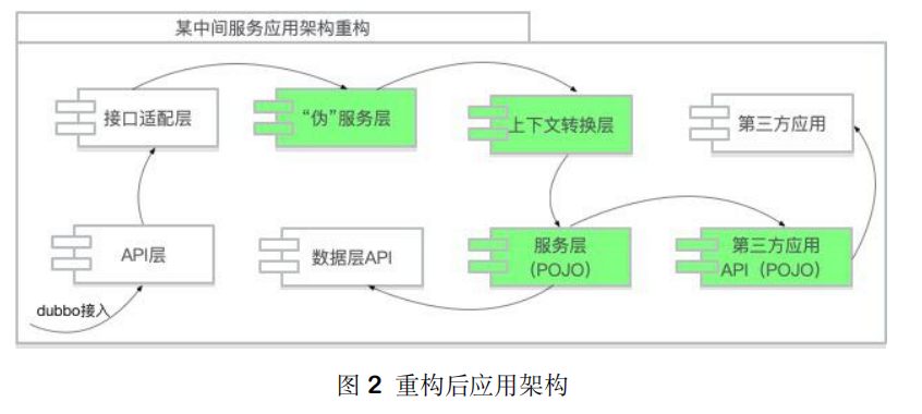 抽象出访问第三方应用的 API 层,重构后的应用架构如图 2 所示。注:出于架构图视觉考