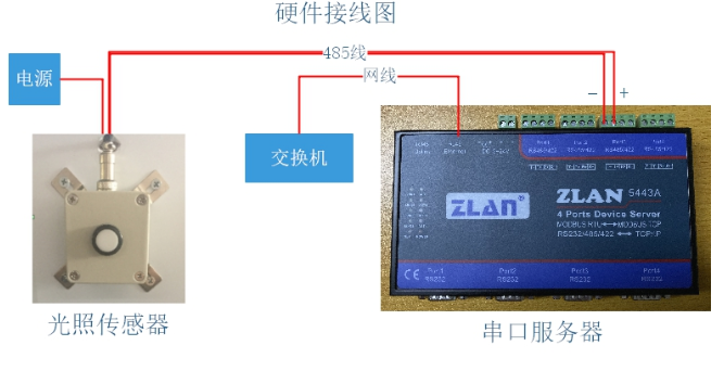 首先先介绍一下设备的连线,温湿度传感器由24V直流电源供电,使用modbus协议通讯,485线传输数据,连接着串口服务器,串口服务器再用网线连接交换机,这样就可以通过以太网采集到温湿度数值了。