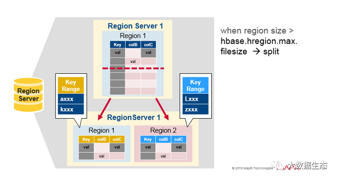 最初,每个表只有一个 Region。当 Region 过大时,会分为两个子 Region。两个子 Region(代表原始 Region 的一半)可以在同一 RegionServer 上并行打开,拆分时会报告给 HMaster。出于负载均衡的原因,HMaster 可能会将新 Region 迁移到其他服务器。