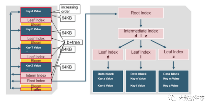 HFile 包含多层索引,从而使 HBase 无需读取整个文件即可查找数据。多级索引类似一个 B+ 树:
