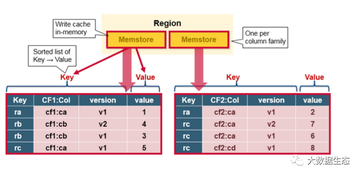 MemStore:写缓存,存储还没写入磁盘的新数据。在写入磁盘之前先对其进行排序。每个 Region 的每个列族都有一个 MemStore。