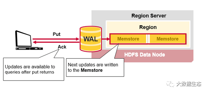 第二步是将数据写入 WAL 后,将其存储在 MemoryStore 中(写缓存)。然后将 Put 请求的确认返回给客户端。