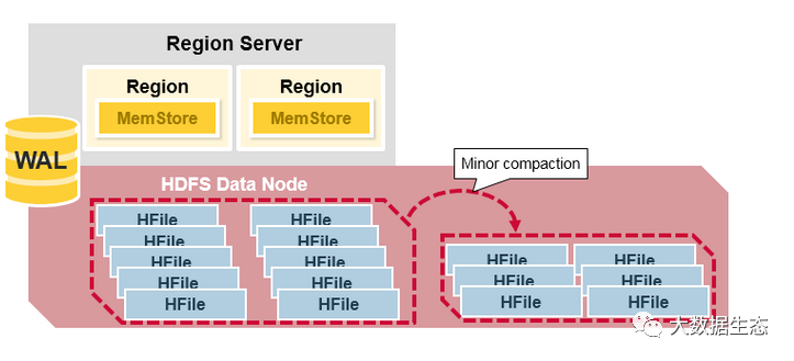 HBase 会自动选择一些较小的 HFile,将它们重写合并为一些较大的 HFile。此过程称为 Minor 压缩。这样通过将比较多且较小的文件重写为比较少但较大的文件可以减少存储文件的数量。