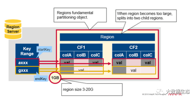 HBase 表根据 RowKey 的开始和结束范围水平拆分为多个 Region。每个 Region 都包含了 StartKey 和 EndKey 之间的所有行。每个 Region 都会分配到集群的一个节点上,即 RegionServer,由它们为读写提供数。RegionServer 大约可以管理 1000 多个 Region。