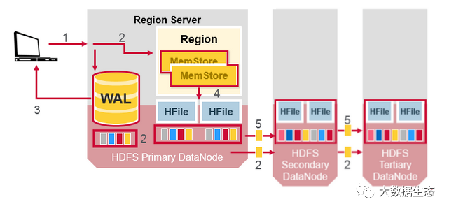 所有读写请求都来自/发往主节点。HDFS 会备份 WAL 和 HFile 数据块。HFile 数据块备份会自动进行。HBase 依赖 HDFS 来保证存储文件的数据安全。当数据写入 HDFS 时,一个副本写入本地,然后将其备份到辅助节点,而第三个副本被写入第三节点。