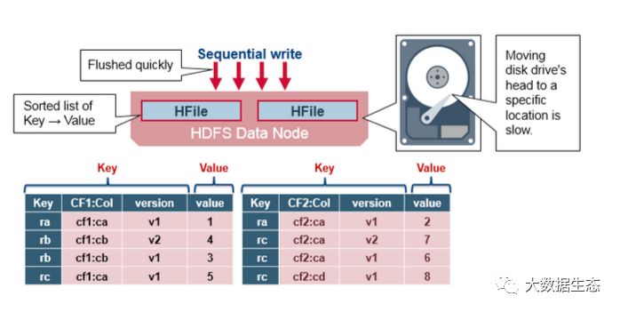 数据以有序的 key/values 形式存储在 HFile 中。当 MemStore 累积足够多的数据时,就会将整个有序 KeyValue 集顺序写入到一个新的 HFile 中。顺序写入的方式会非常快,因为它避免了移动磁盘驱动器磁头。