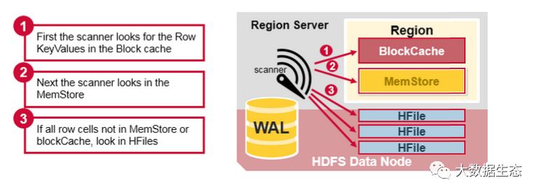 首先,扫描程序在 BlockCache(读缓存) 中查找行单元。最近读取过的键值存储在这里,并且当内存不足时需要删除最近最少使用的数据。