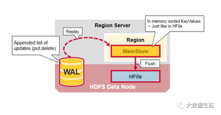 WAL:预写日志是分布式文件系统上的一个文件。用于存储还没持久化存储的新数据,并在出现故障时可以进行恢复。