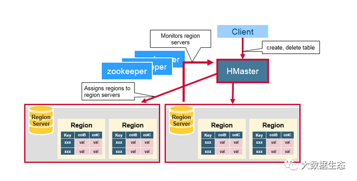 Region 的分配,DDL(创建,删除表)操作均由 HMaster 负责处理。