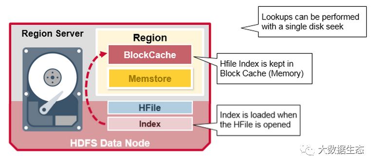 刚才我们讨论的索引,在 HFile 被打开时会被载入内存,这样数据查询只要一次磁盘查询。