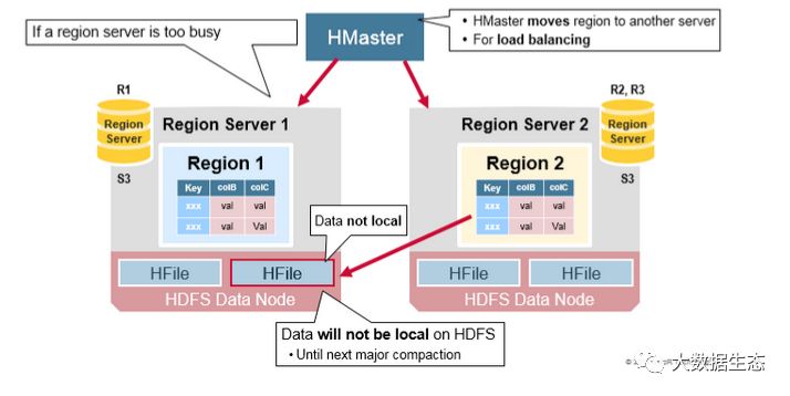 拆分最初发生在同一个 RegionServer 上,但是出于负载均衡的考虑,HMaster 可能会将新 Region 迁移至其他 RegionServer。这会导致新的 RegionServer 从远程 HDFS 节点上访问数据,需要等到 Major 压缩时才将数据文件移动到新的 RegionServer 的本地节点上。HBase 数据在写入时是在本地节点的,但是在迁移 Region 时(用于负载均衡或故障恢复),会丢失数据本地性。