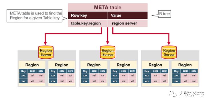 META 表是一个 HBase 表,保存了系统中所有的 Region。META 表类似一棵 B 树。META 表结构如下所示: