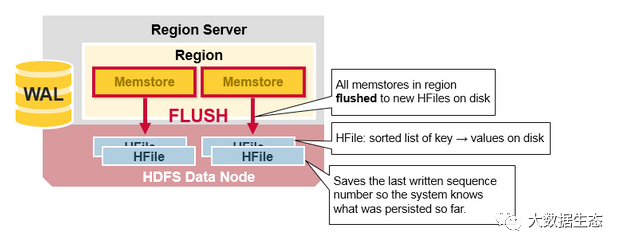 请注意,这也是为什么 HBase 中的列族数量受到限制的一个原因。每个列族都有一个 MemStore。当 MemStore 满之后就会刷写到磁盘。同时还会保存最后写入的序列号,以便系统知道到目前为止所持久化的内容。