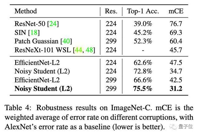在ImageNet-C上,Noisy Student将平均错误率从45.7降到了31.2。