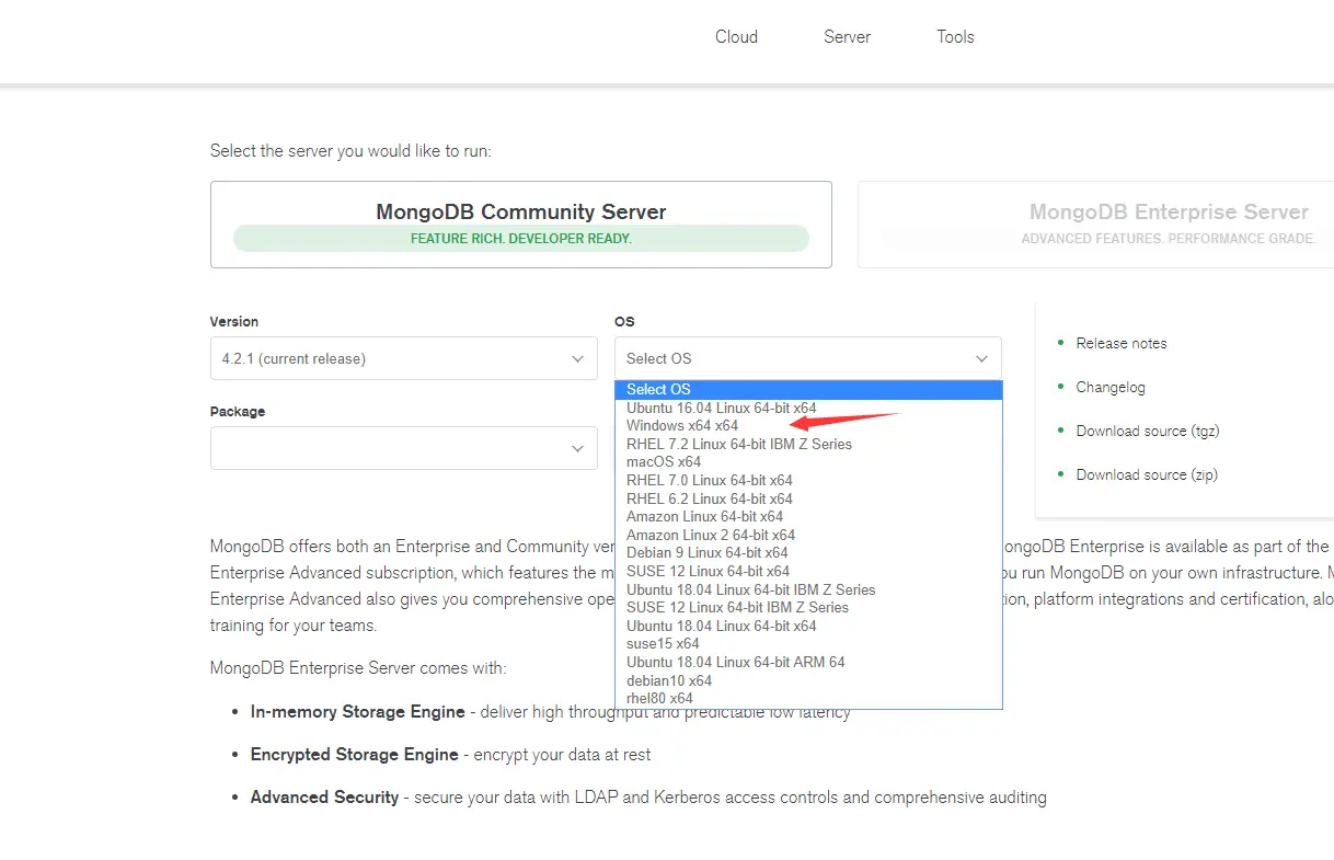 Monogodb 分为社区版和企业版,对于我们学习社区版足够了。那么我们点击选择对应的OS, 我们点击windows ,这里有zip包和msi安装文件我们可以选择msi 下载到电脑进行安装即可。