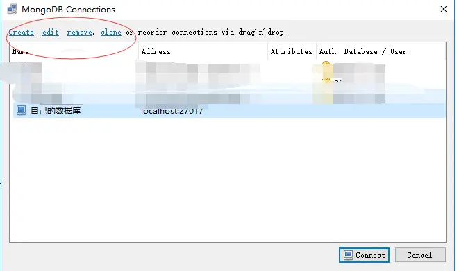 打开工具MongoDB Connections 下面有Create edit 等几个创建连接的按钮,接下来我们创建一个连接连接到我们的数据 点击create