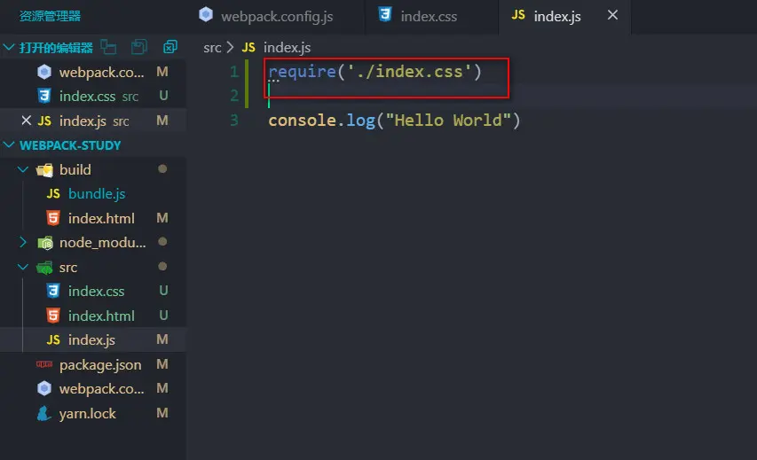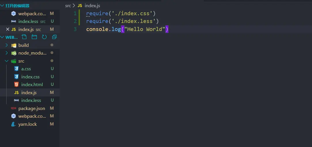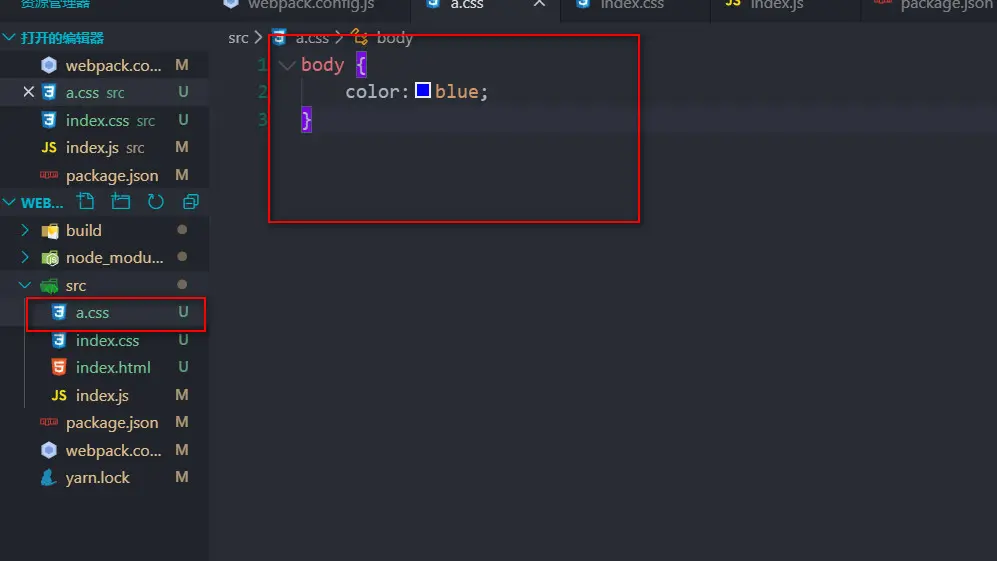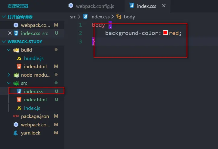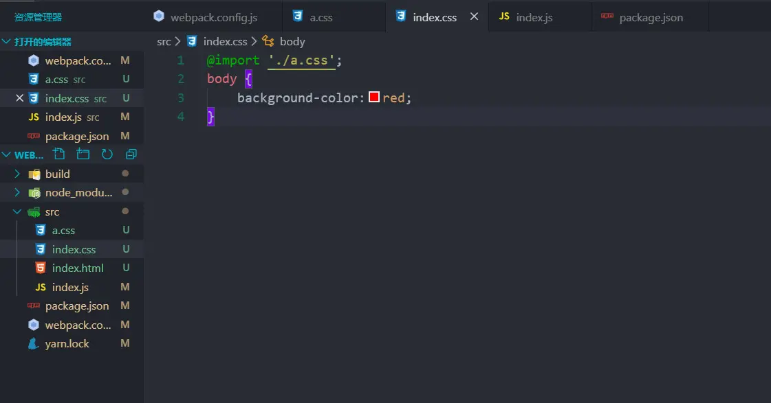 我们知道,webpack 默认是支持 js 模块的,那么,我们现在 src 目录下面建立一个 css 文件,然后在 js 中引入css文件,当然有小伙伴会问了,为什么不在 html中引入 css呢? 我们的 html 文件只是一个模板,在它里面引入css的话它会原封不动的输出,我们的css并不会打包到build目录下面,所以这种方法是不行的。