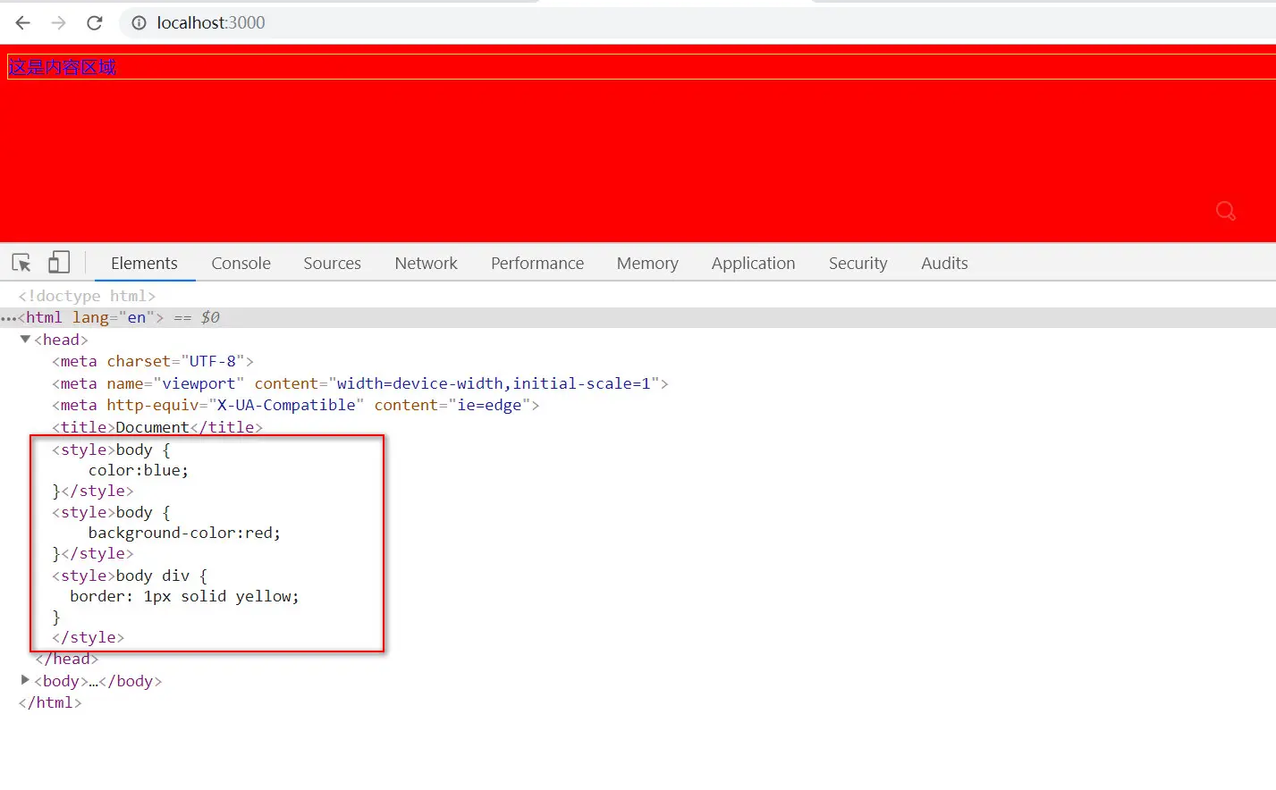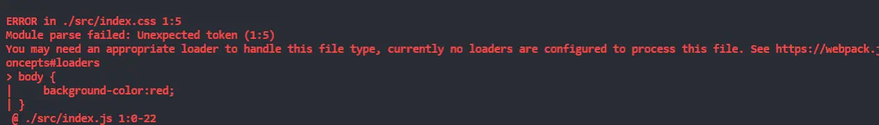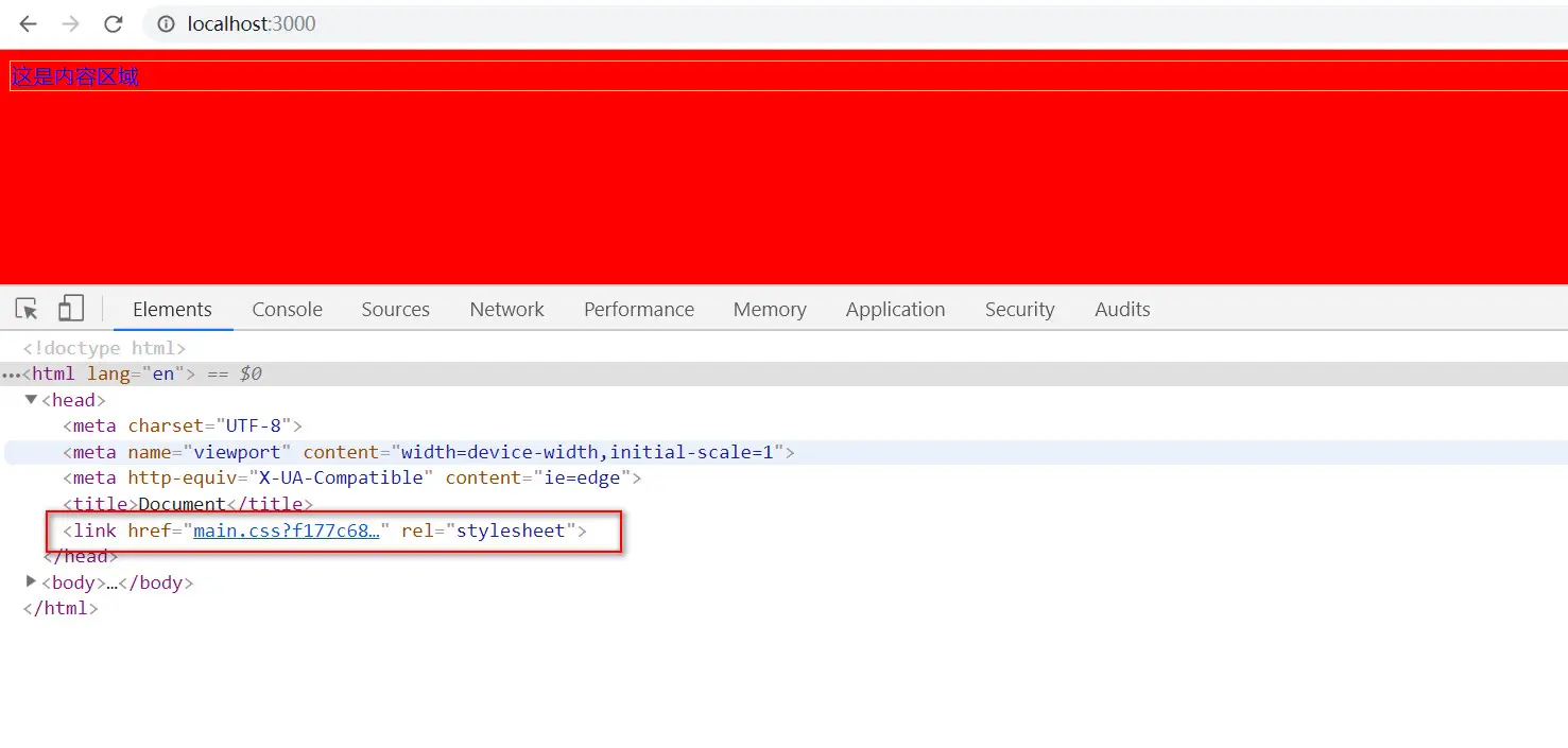 yarn add css-loader style-loader -D. 安装好之后再重新启动服务:这个时候已经运行正常了,那么,让我们来访问一下页面: 可以看到,页面的背景现在应景变成了红色,和咱们设置的颜色是一样的,说明 css-loader 运行成功。 打开调试工具,可以看到我们的样式是插入到head标签中的,这说明我们的 style-loader也是起作用的。