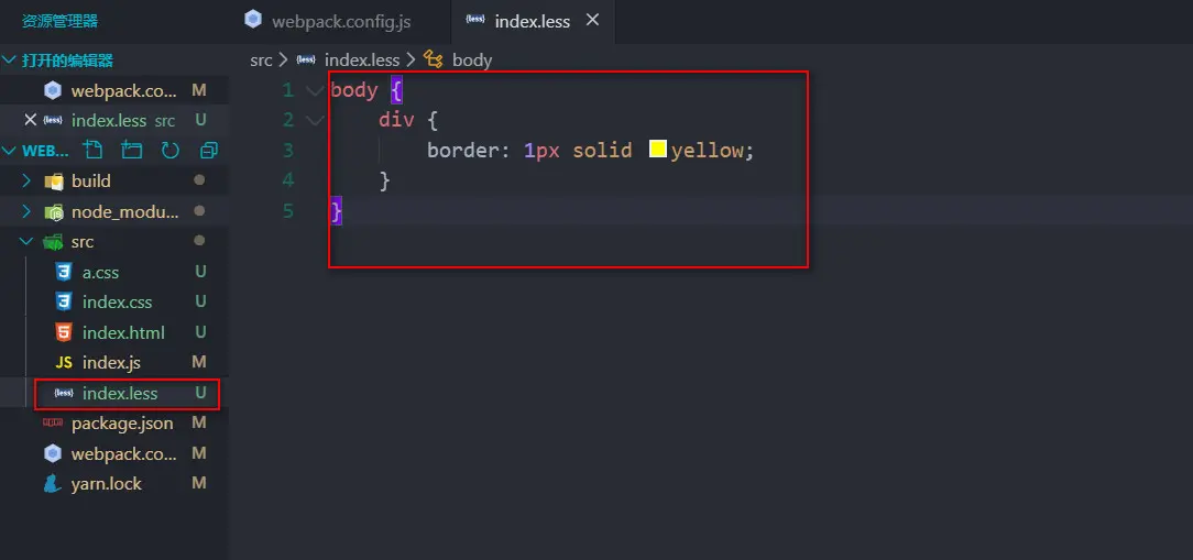 - css文件已经可以处理了,如何处理less文件呢,这个时候我们就需要先安装 less 和 less-loader来处理less了。