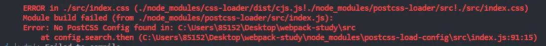 运行结果如图,为什么没有找到呢,那是因为我们只是配置了 loader,但是还没有安装这两个loader,所以找不到,安装命令: